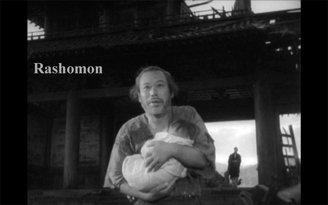 A woodcutter and a Priest sit stunned in what appears a dilapidated though majestic gate. Outside the wind and rain are lashing. They are joined by a character about whom we know nothing till the end. And a story is told. Of a man found dead in the forest and the four versions by four different people (a bandit, the dead man’s wife, the dead man, and the woodcutter) of how this man met his death.